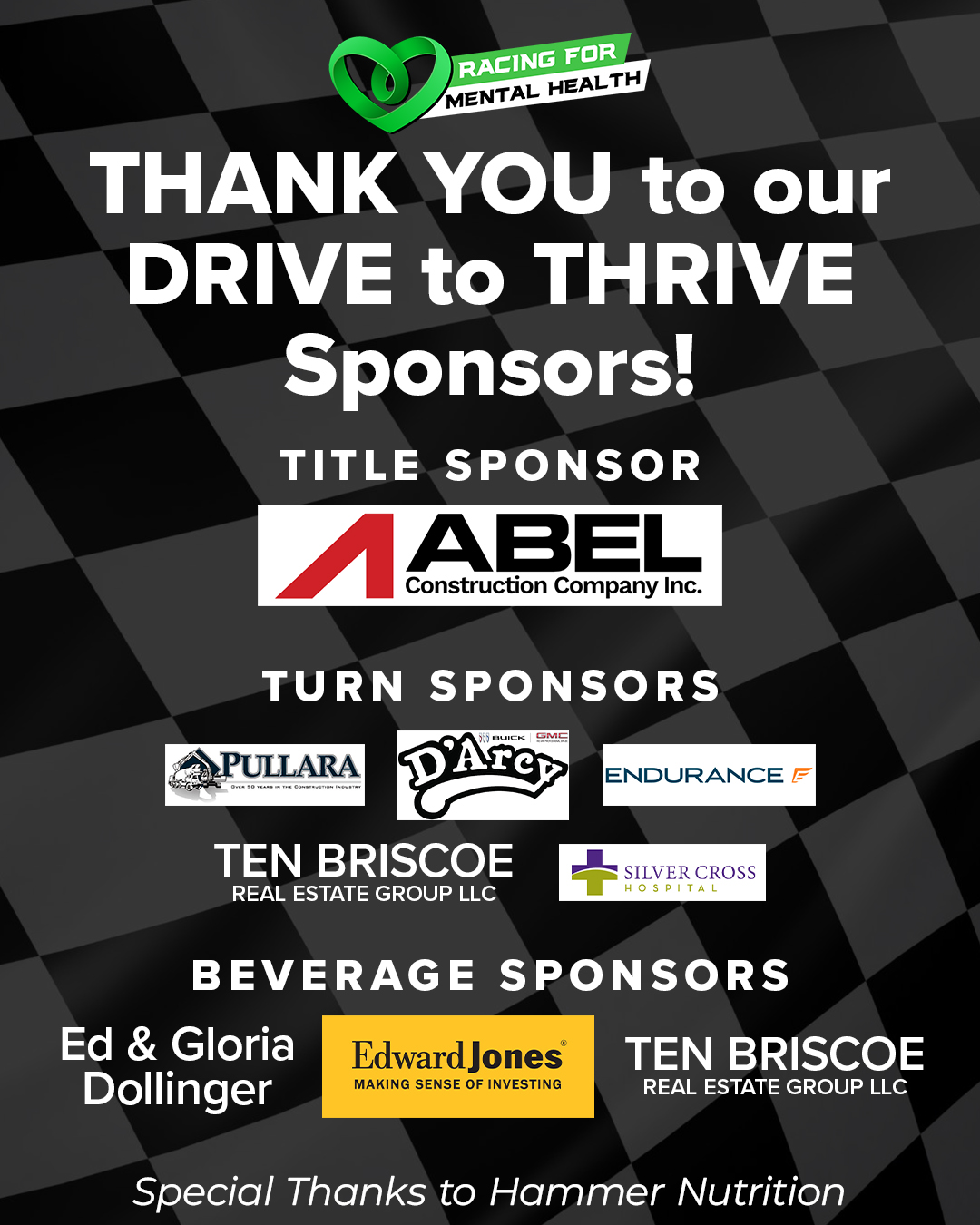 THANK YOU to all of our incredible sponsors for the upcoming Drive to Thrive event presented by Racing For Mental Health. Don’t miss out on the opportunity to fundraise for a worthy cause!